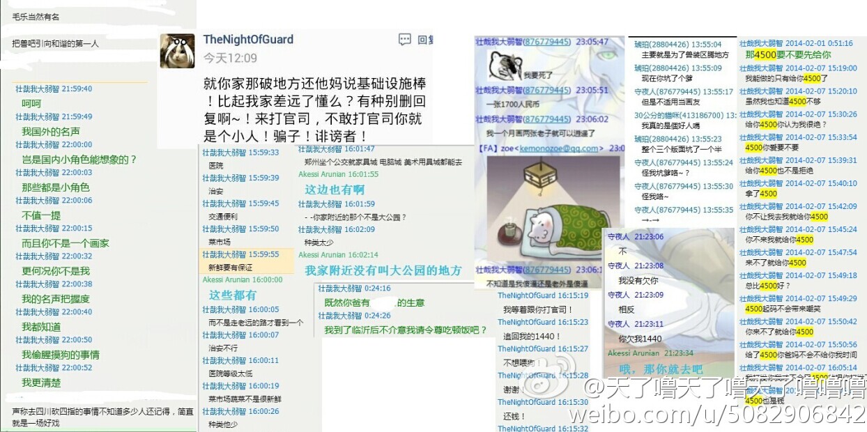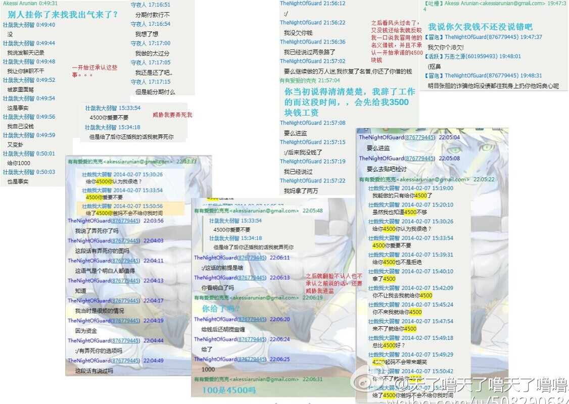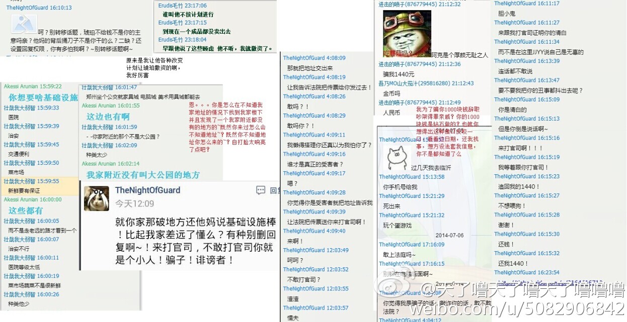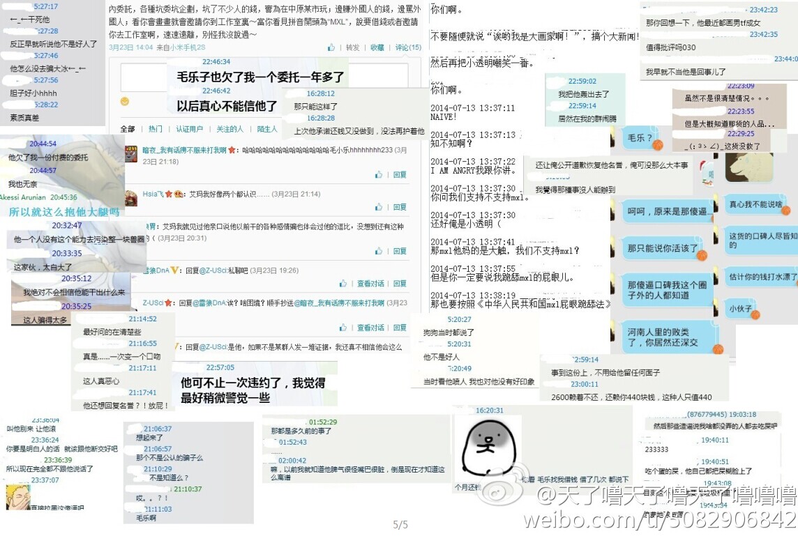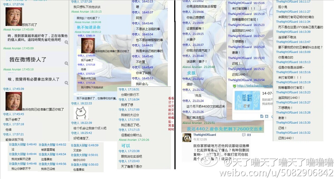 大家好,我是天了噜,突然发这种贴打扰到大家实在抱歉,但是没有办法,因为最近有一个十分无耻的人不停地找别人麻烦,并且坑了一批人,我们给过他机会,但是他不以为然,我们也只好把他的所作所为公开出来,让大家远离这个人渣,不要再跟他打交道,下面楼层会放出截图跟解释,这些都转自我的微博:http://wei