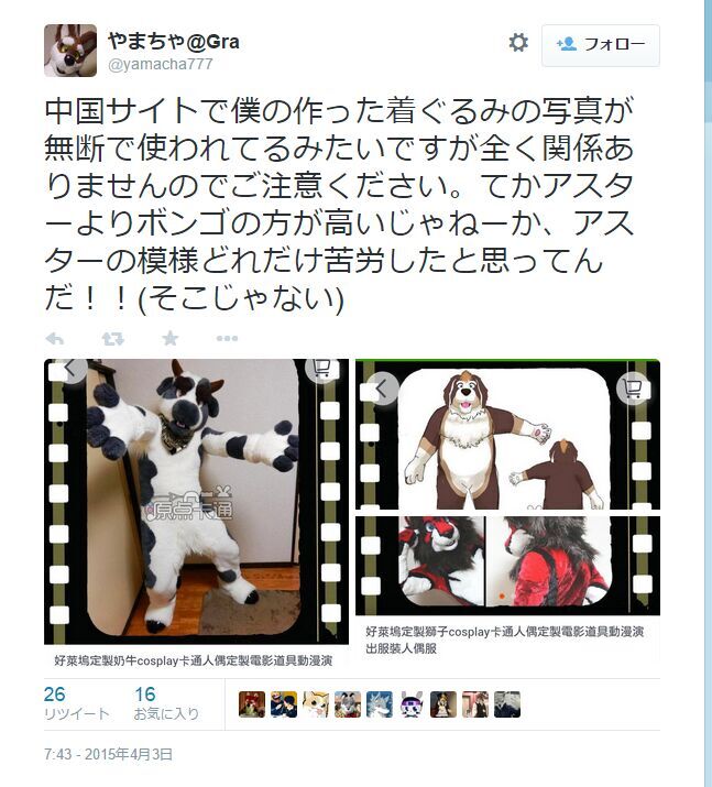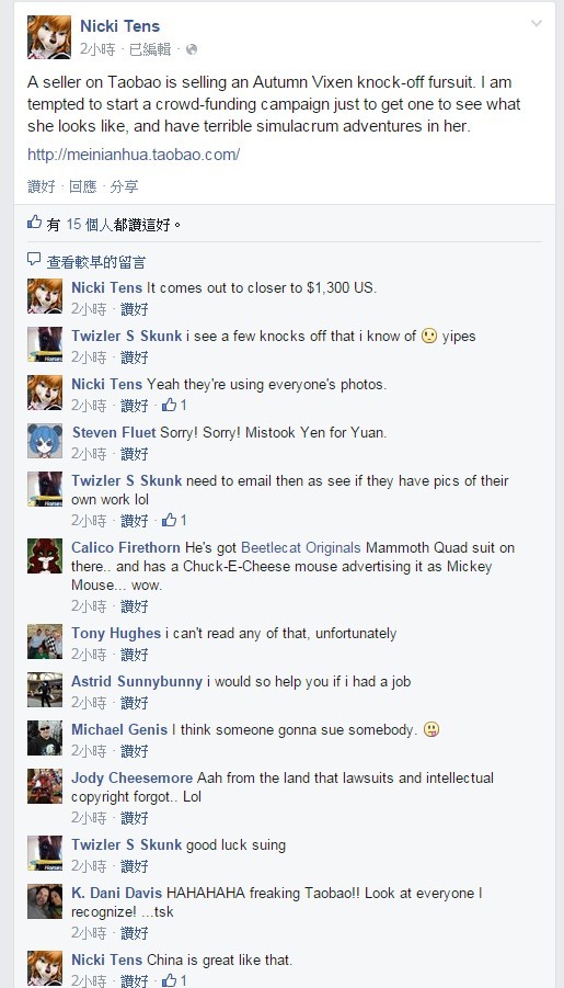 妈啦掉脸掉到全地球都知道了!!!!!大意就是说 http://meinianhua.taobao.com/?v=1 用了Autumn Vixen Fursuit 的图当了是自己做的, 之后 Nicki Tens 看不过眼就贴了出来.....